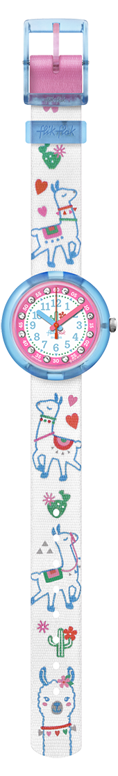 El divertidísimo diseño de llamas de COMO SE LLAMA les sacará una sonrisa cada vez que miren la hora. Este reloj Swiss made presenta gemas en la esfera de impresión digital, así como una caja de plástico azul transparente y una correa de tela estampada.